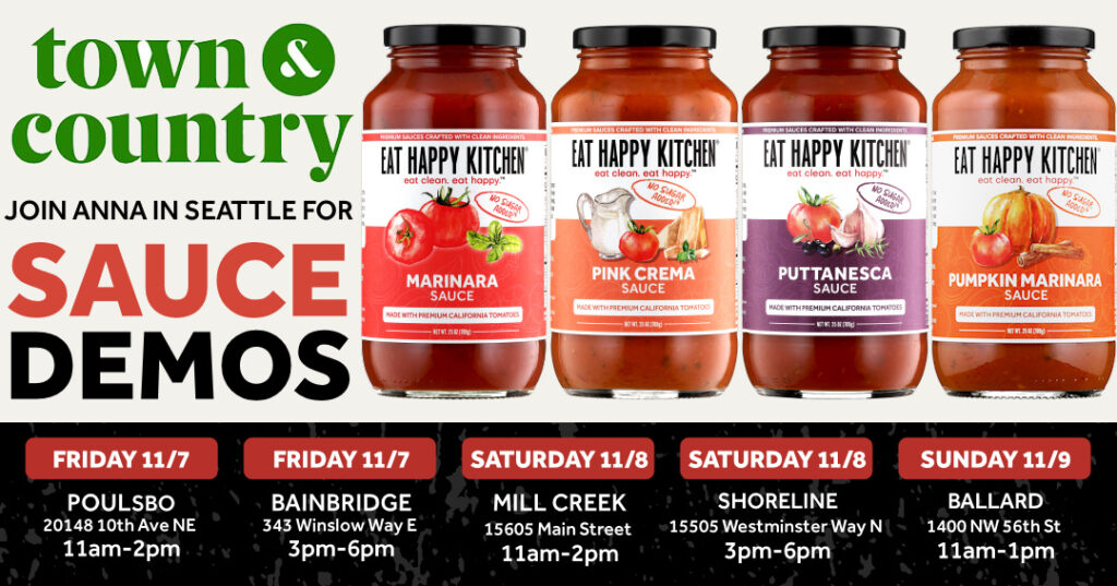 Roll through Town & Country Markets at the scheduled times in the poster to come see Anna demo sauces and sign copies of Eat Happy Italian (available for purchase).